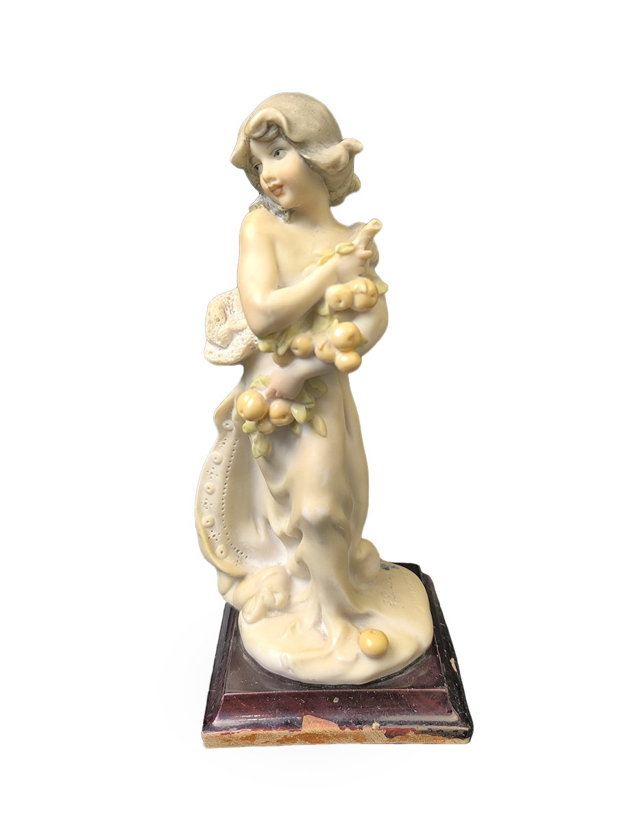 Изумительная итальянская статуэтка девушка с фруктами, бисквитный фарфор молочного оттенка, великолепная ручная работа от талантливого скульптора, деревянная подставка.
