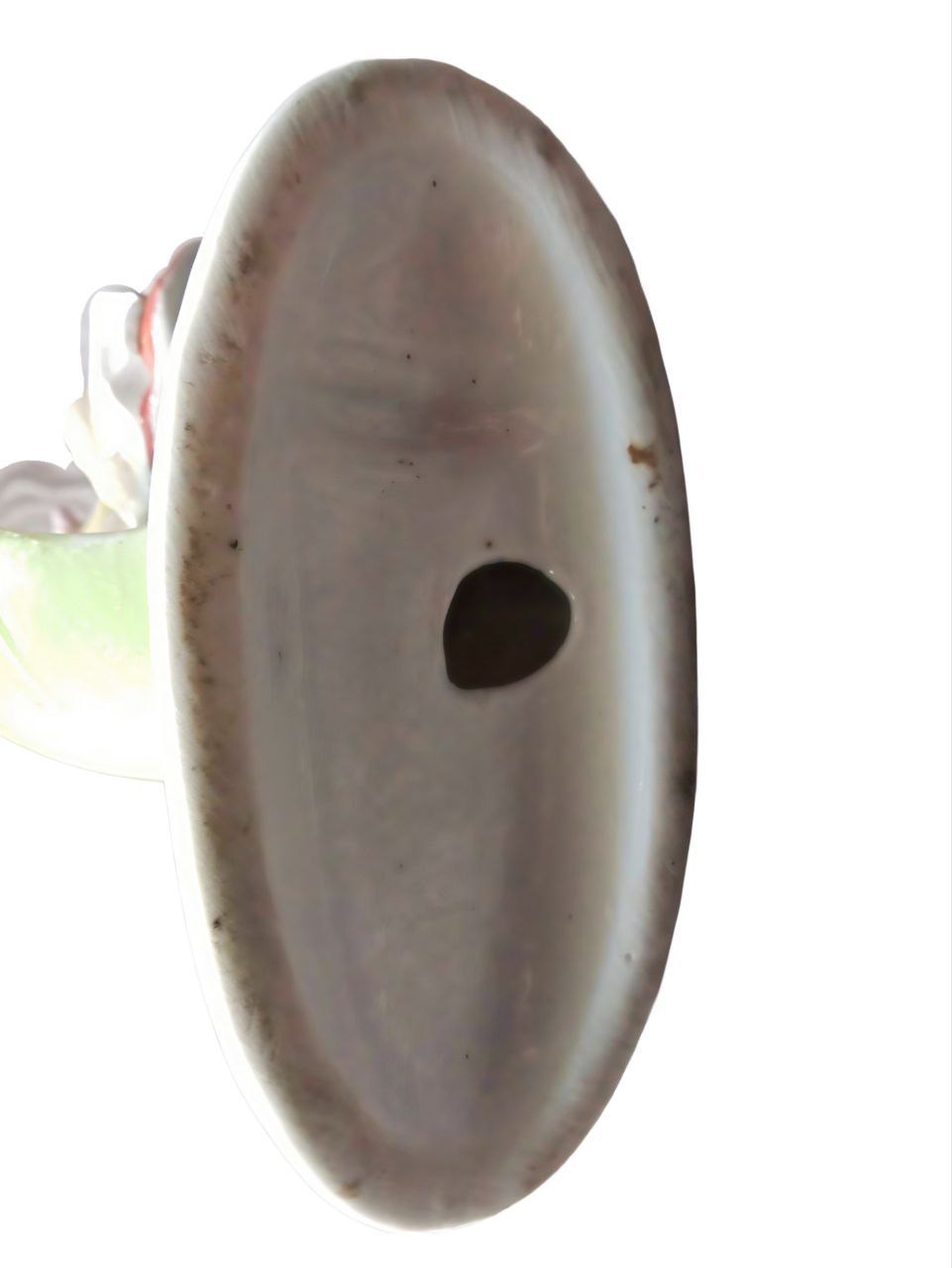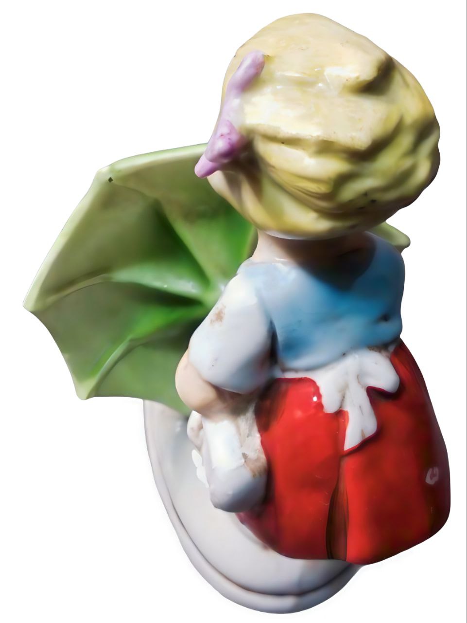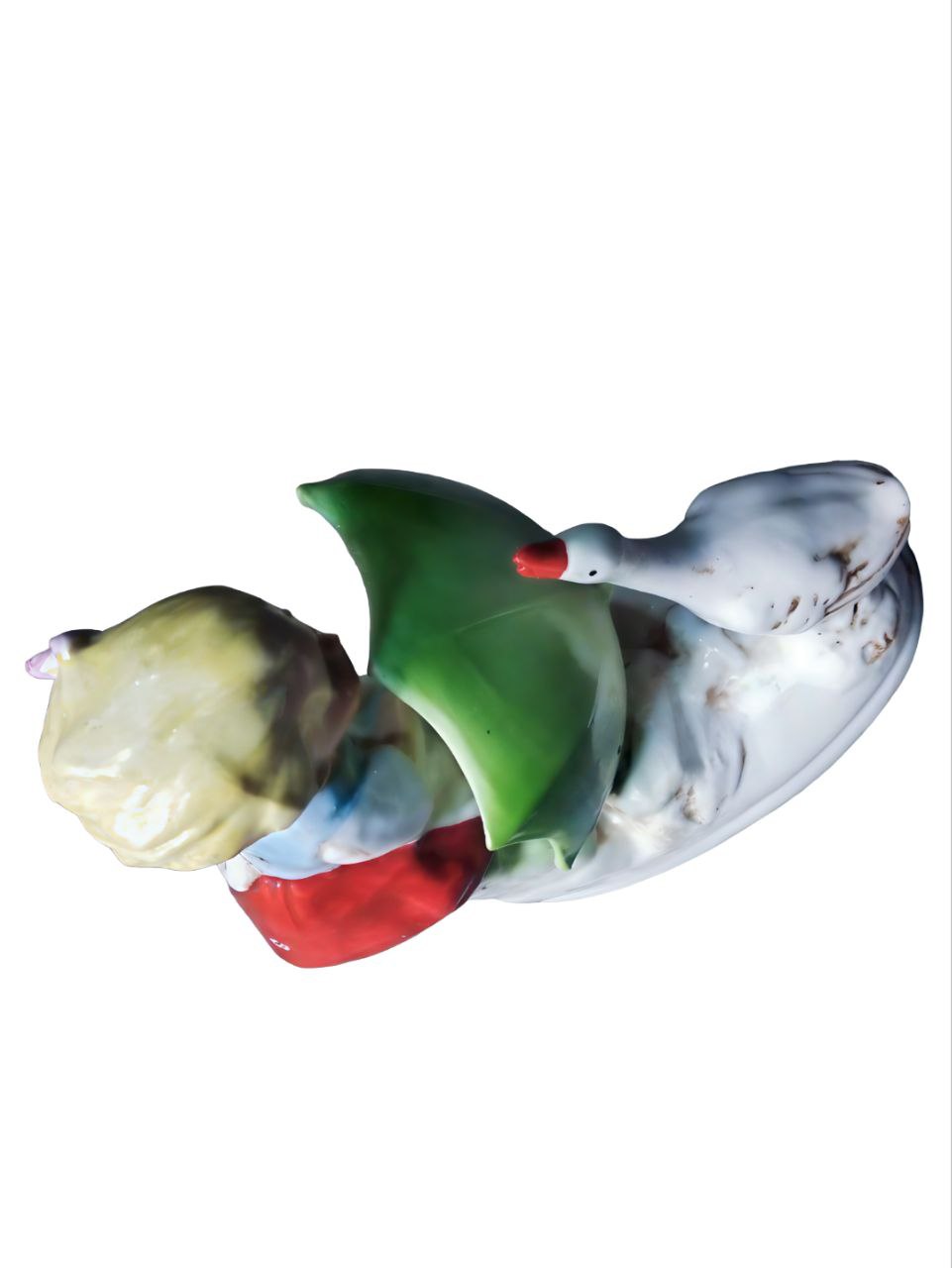Статуэтка изображает маленькую девочку, использующую зеленый зонтик, чтобы отбиться или поиграть с любопытным гусем. Это распространенный сюжет для немецкого фарфора того периода.