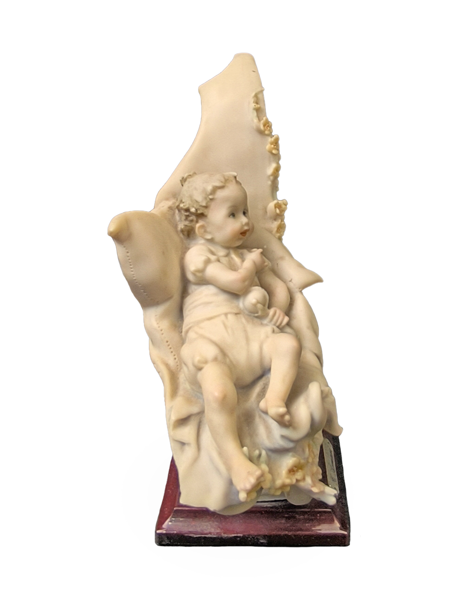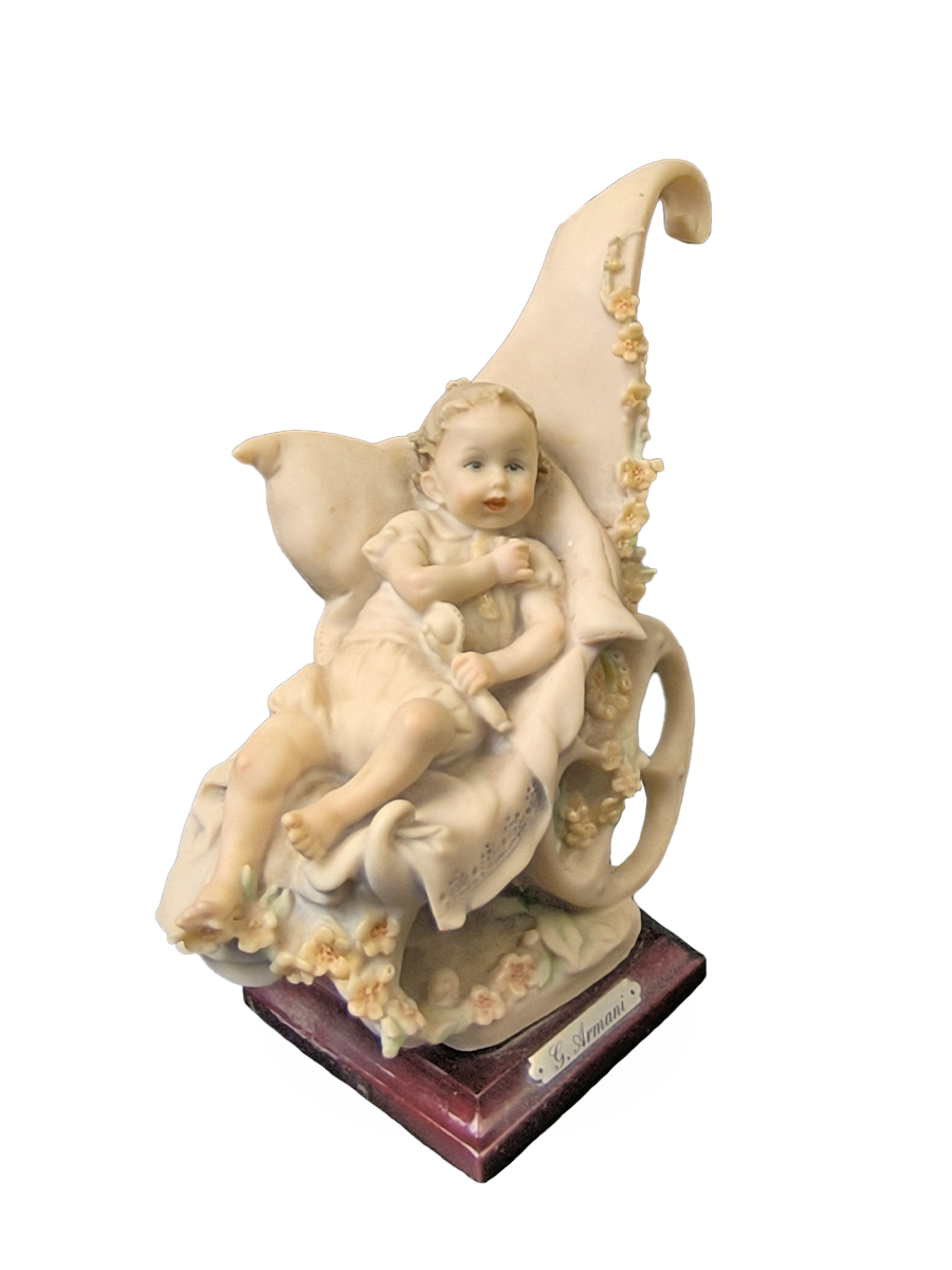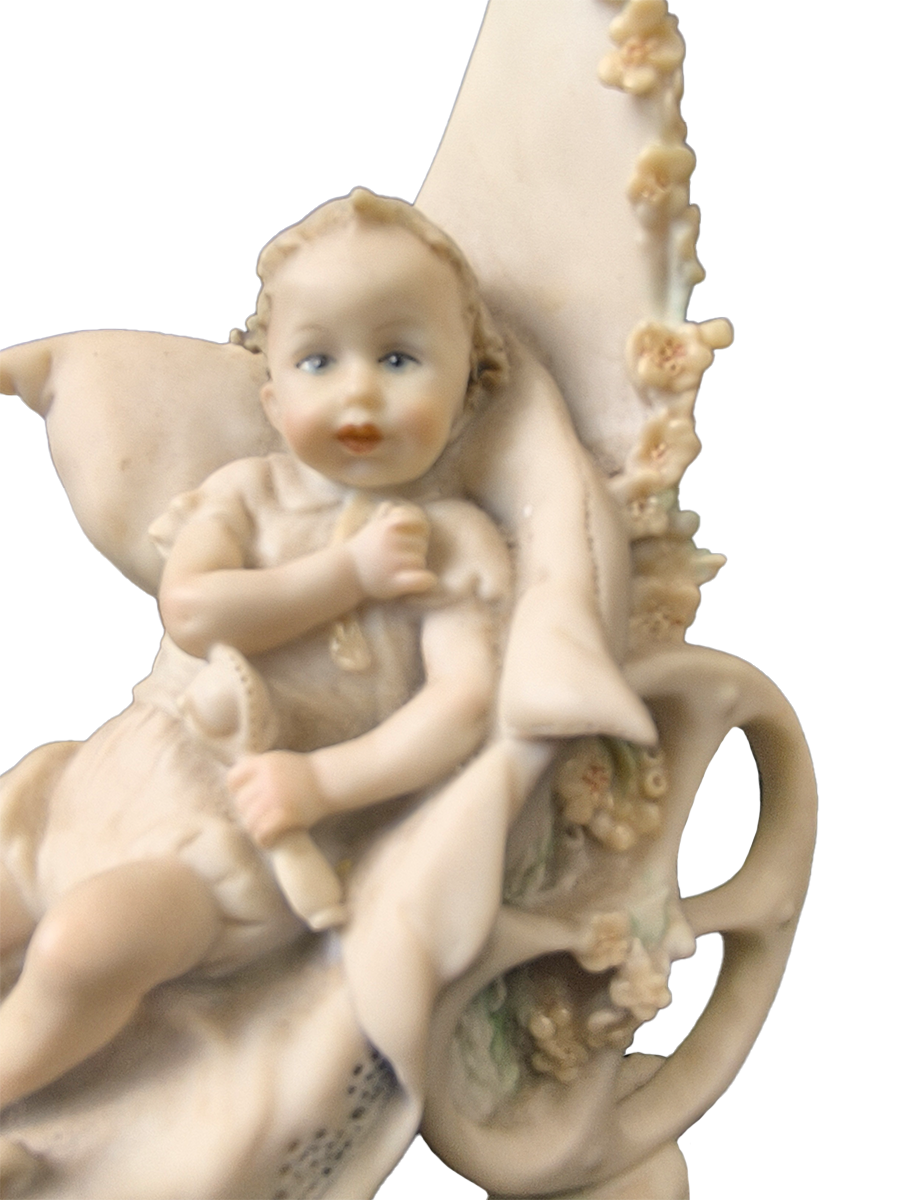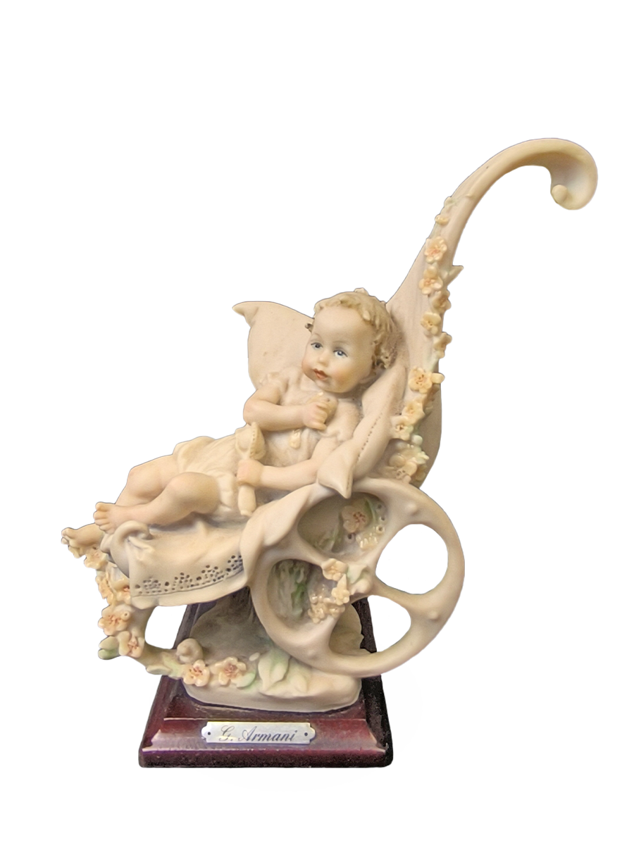 Статуэтка изображает младенца с большими глазами и розовыми губами, сидящего в старинной коляске, украшенной цветами.