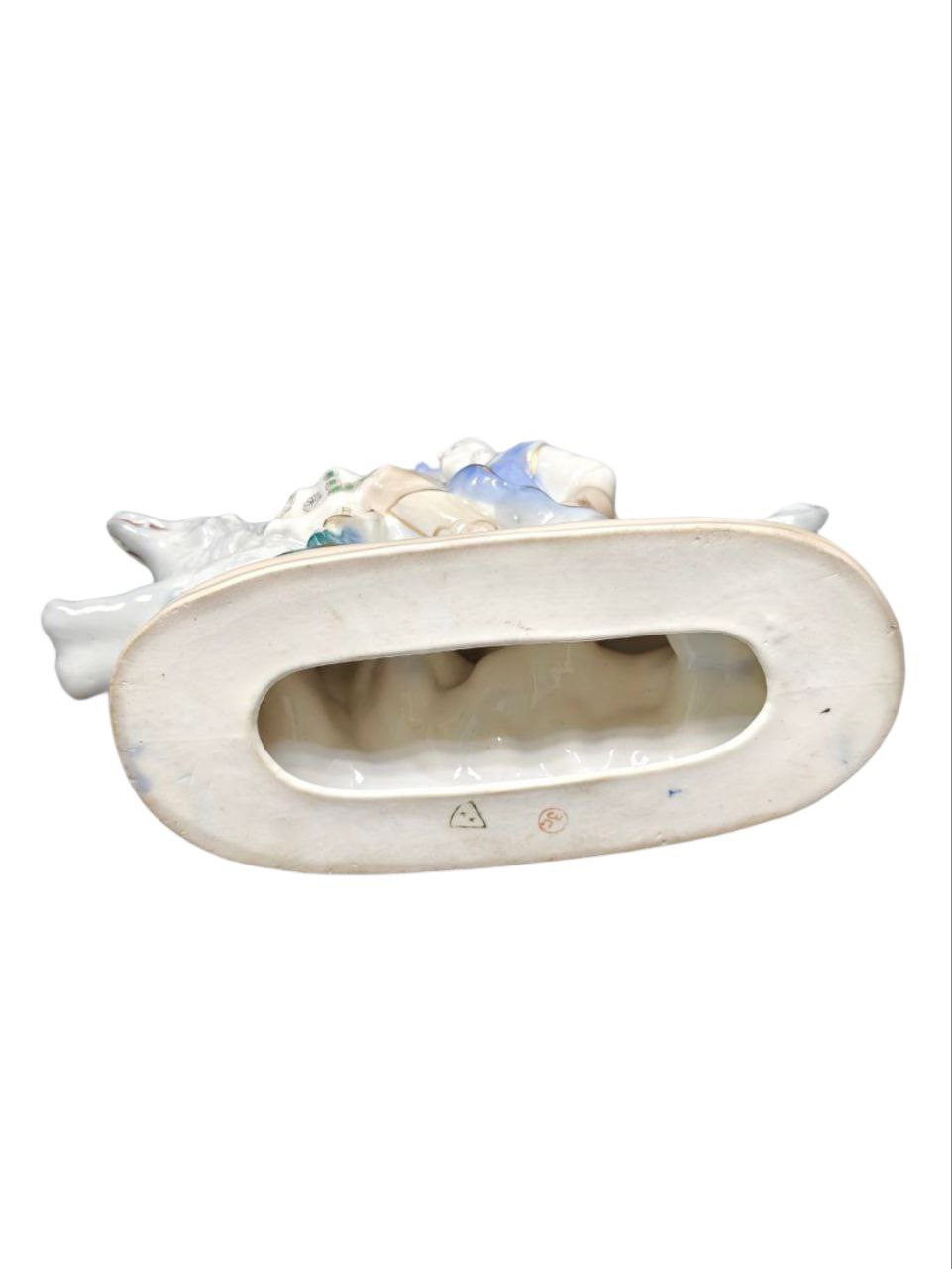 Выразительный образ наполнен динамикой, с чёткой прорисовкой деталей. Сказочность скульптуры выгодно подчеркивается удачным сочетанием цветовой гаммы и горящей позолоты. Достаточно редкая статуэтка.