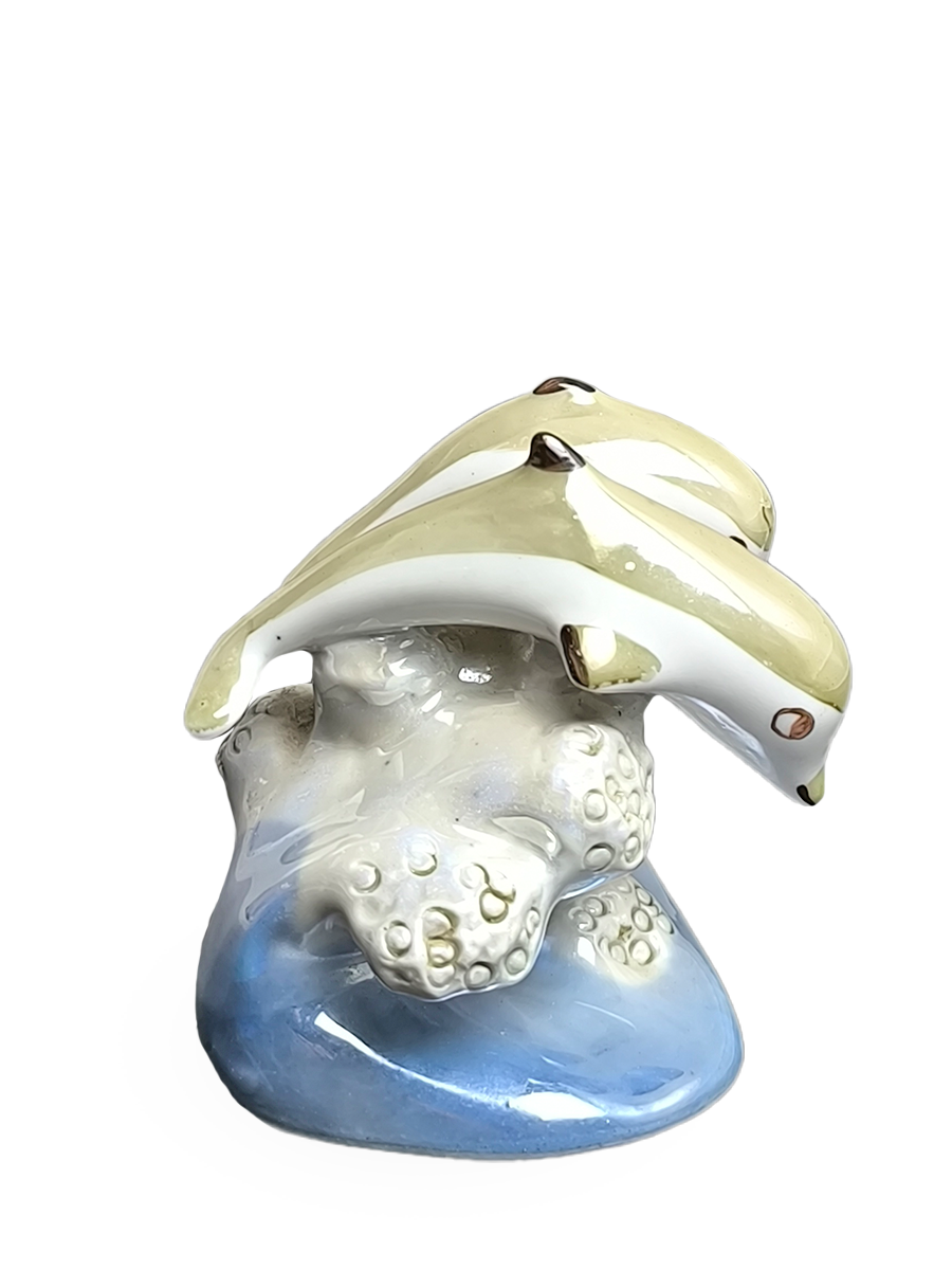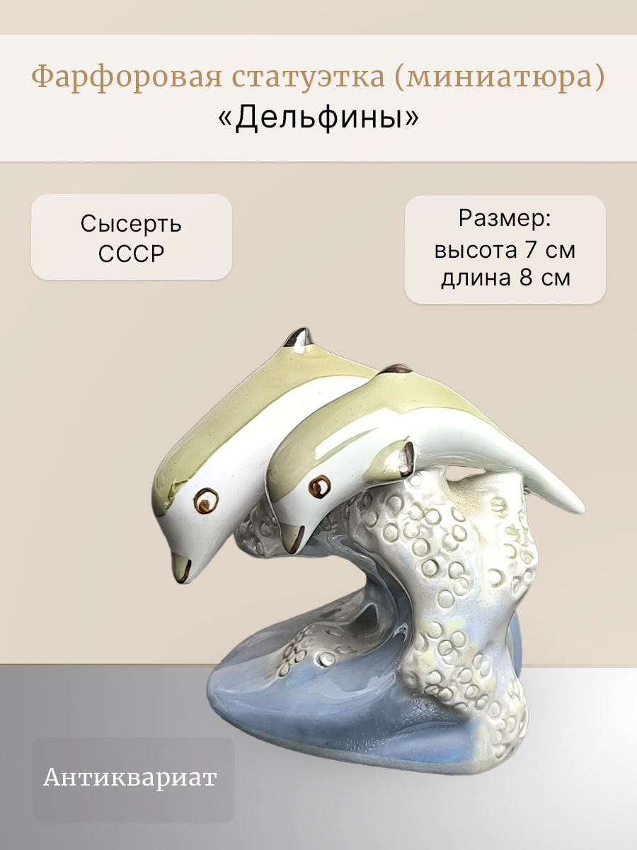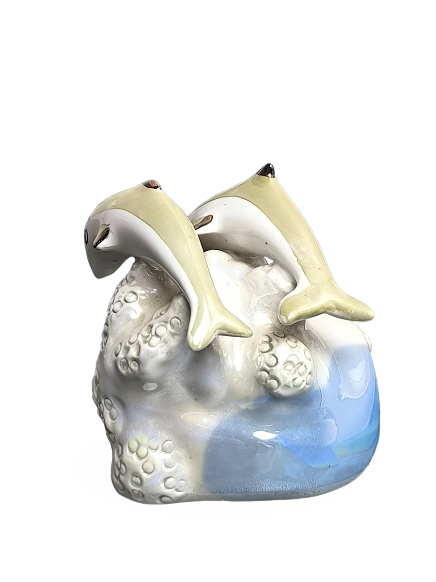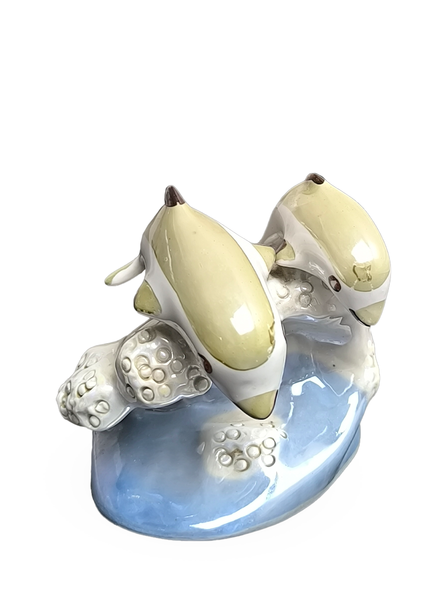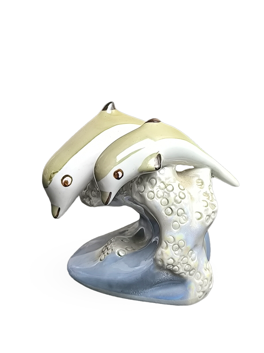 Статуэтка в виде двух дельфинов, играющих в воде. Выполнена из высококачественного фарфора с использованием техники подглазурной росписи. Все детали тщательно проработаны и окрашены в яркие и насыщенные цвета.