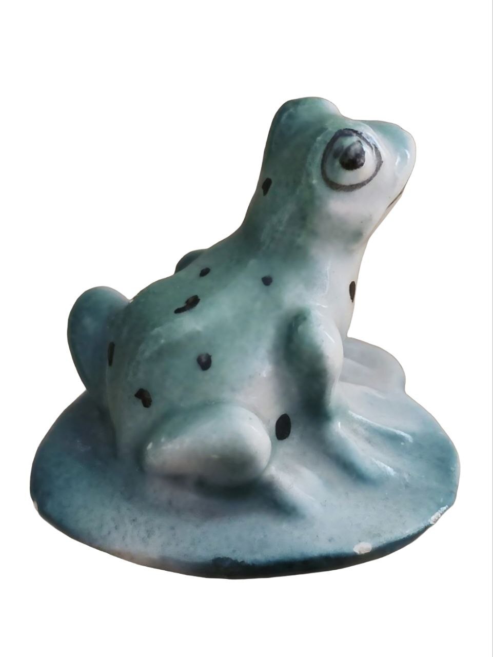 Эта фарфоровая статуэтка — широко распространенная миниатюра.. Она изображает маленькую лягушку на листе кувшинки. Фигурка отличается реалистичной формой и характерной окраской в оттенках зеленого и серого с черными пятнами.
