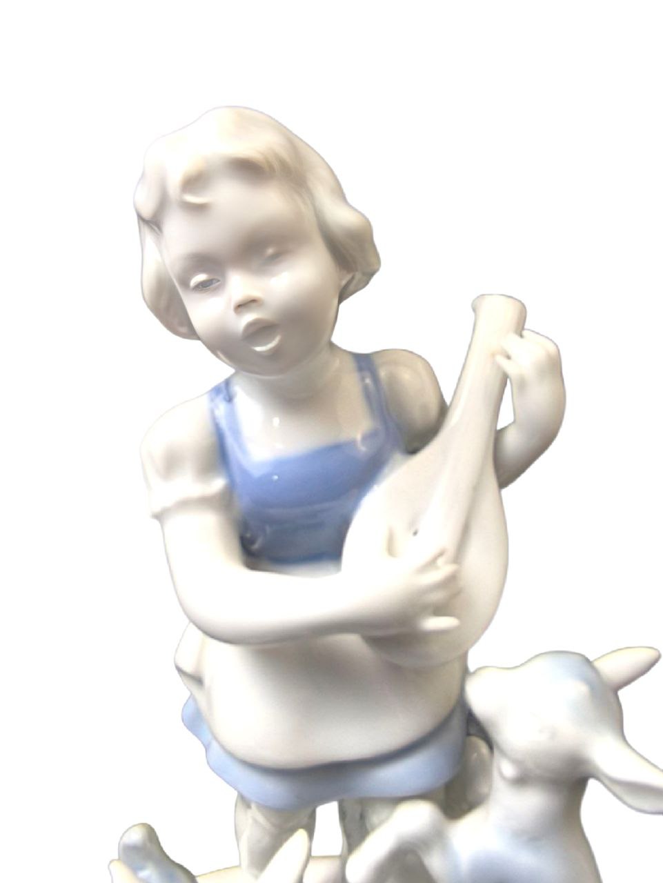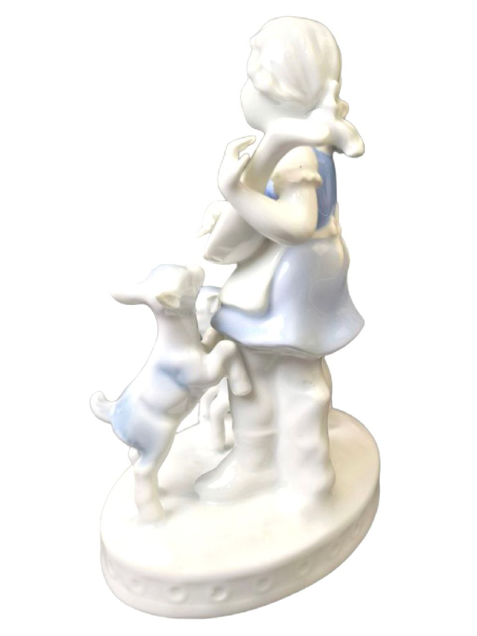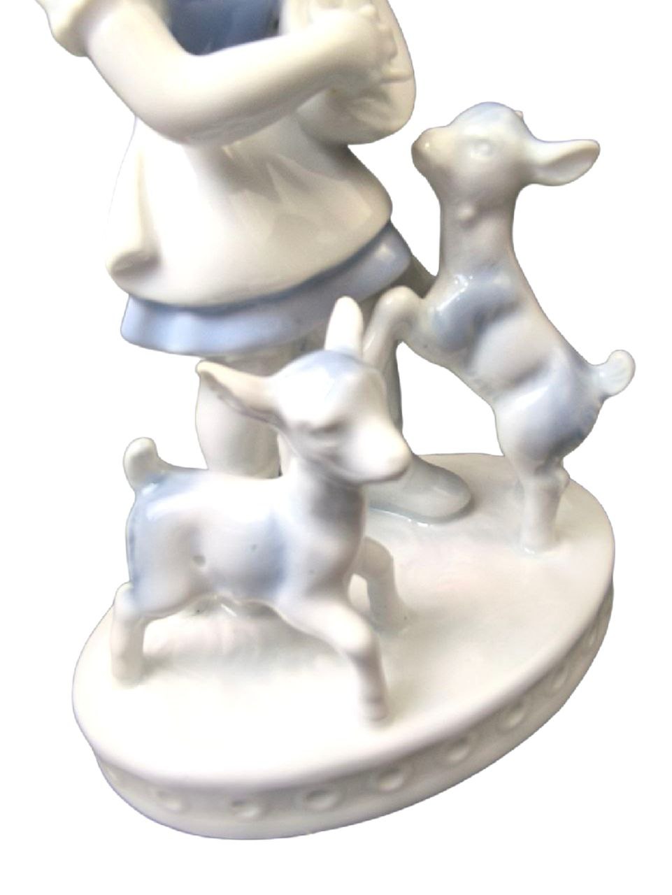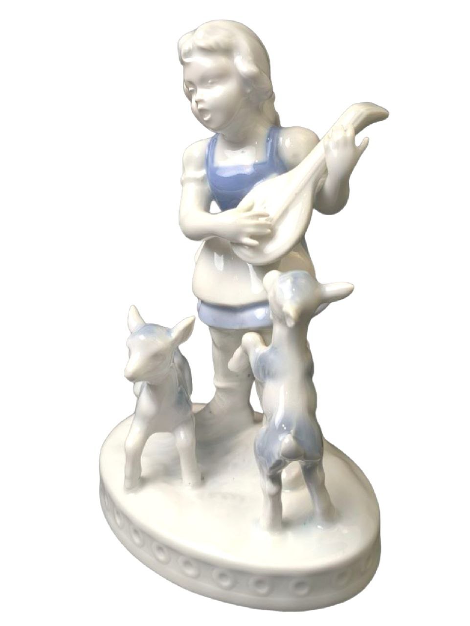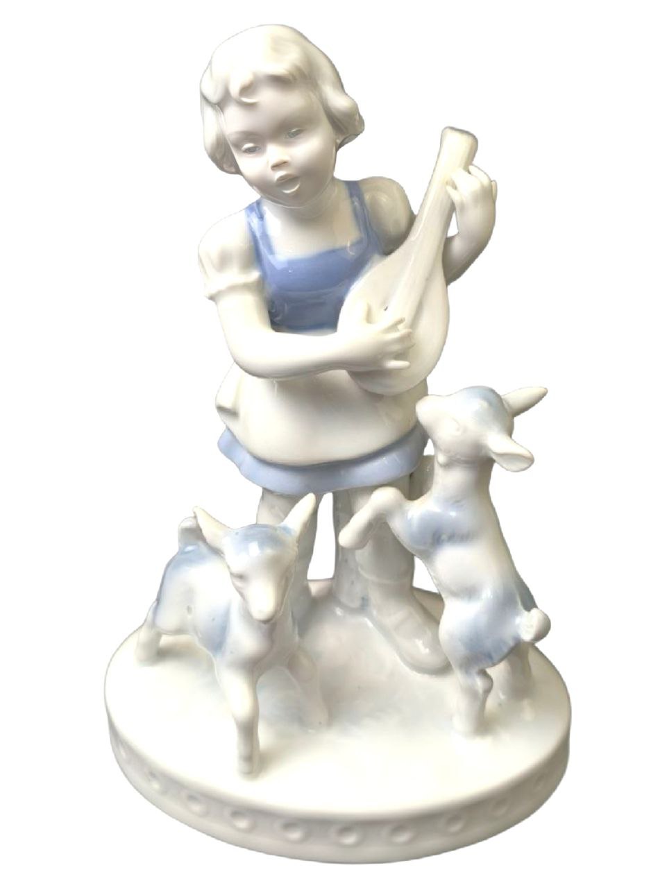 Статуэтка выполнена из белого фарфора с синими деталями на одежде девочки. Девочка играет на струнном инструменте, а козлята стоят рядом с ней. Основание статуэтки имеет рельефный узор по краю.