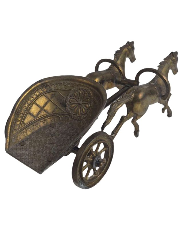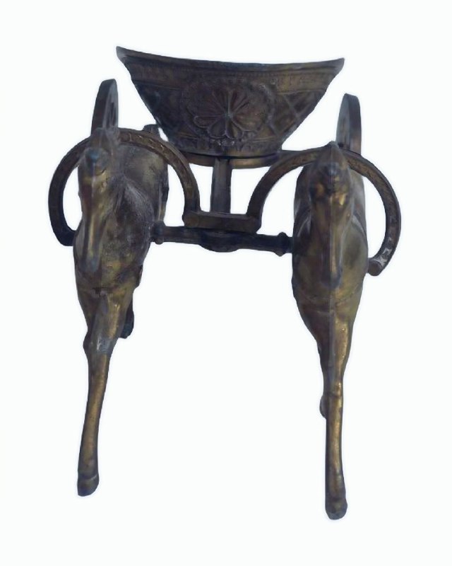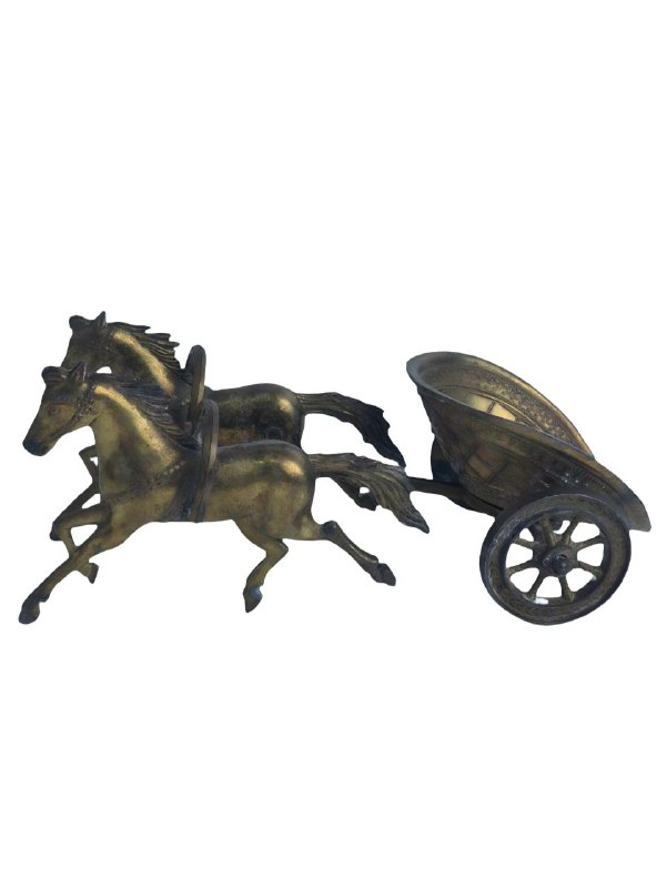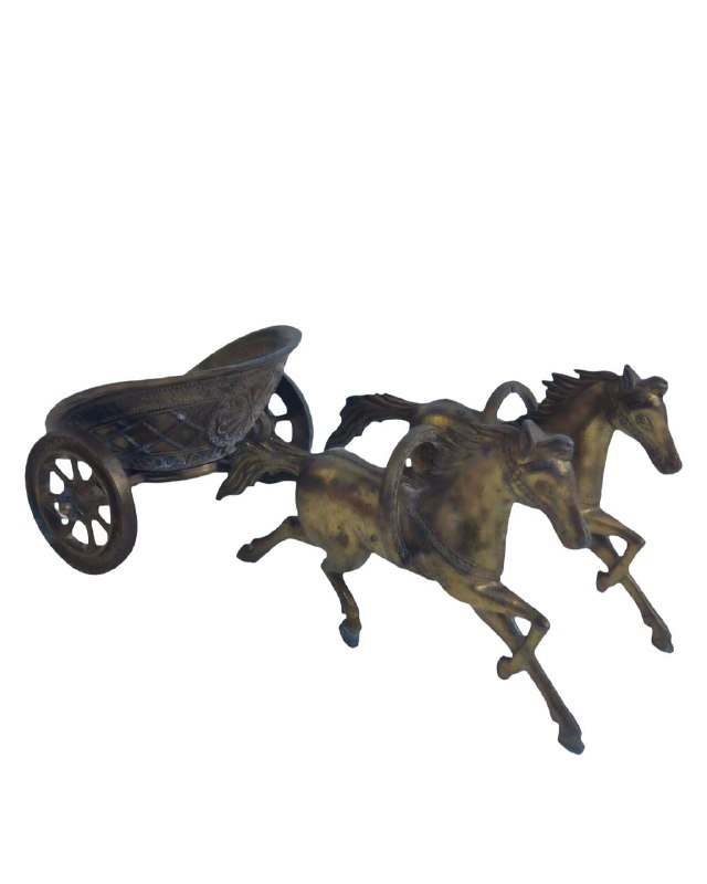 На представленном изображении показана винтажная декоративная статуэтка, изображающая римскую колесницу, запряженную двумя лошадьми. Подобные изделия часто изготавливались в середине XX века в Европе или Индии и предназначались для украшения интерьера.