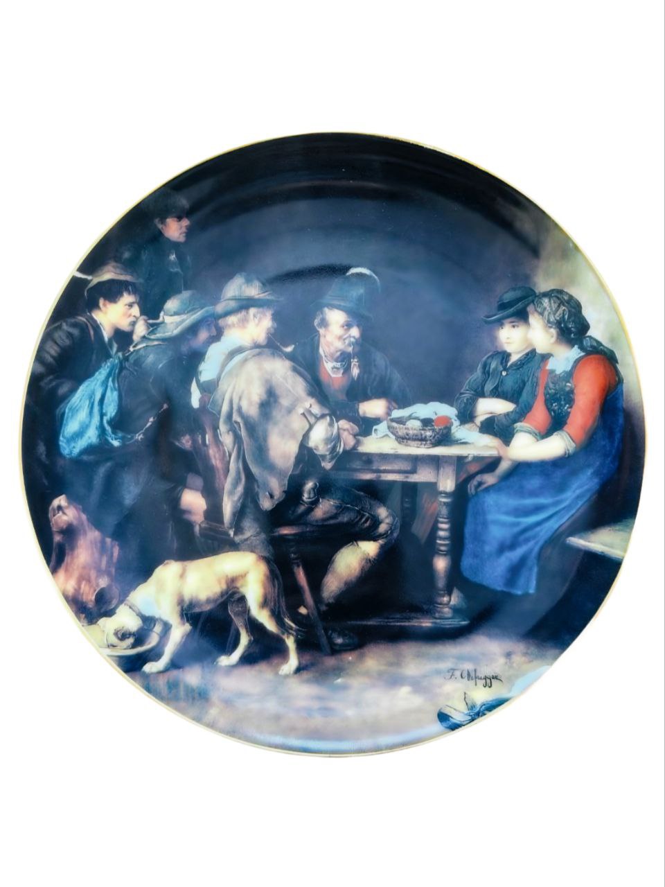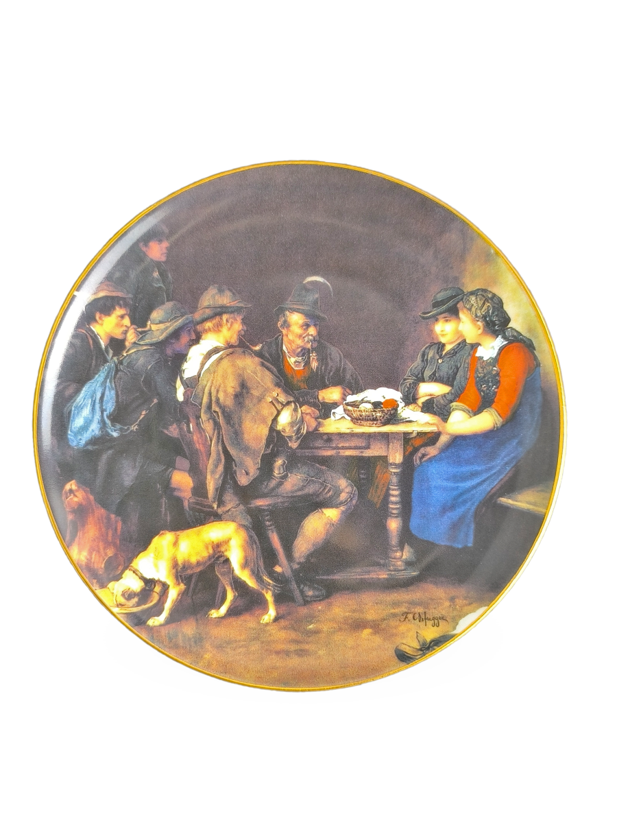 На тарелке изображена сцена непринужденного общения в деревенском интерьере. Группа мужчин в традиционных тирольских шляпах и женщина сидят за столом, в то время как на переднем плане собака ест из миски.
