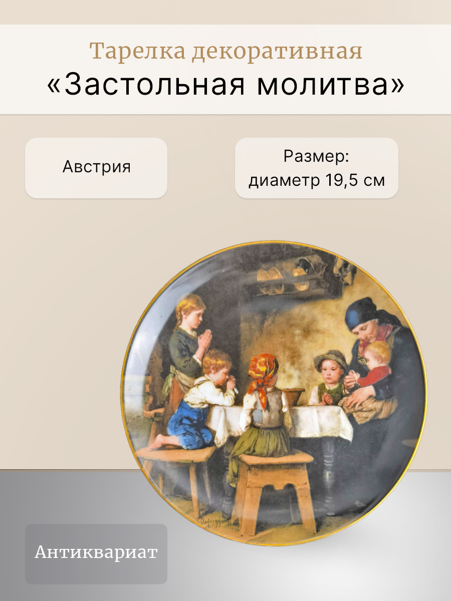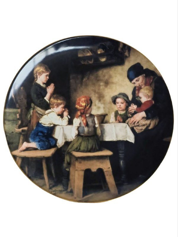 На тарелке изображены пожилая женщина и несколько детей, которые молятся перед приемом пищи в сельской обстановке, что отражает характерные для художника тирольские крестьянские мотивы.