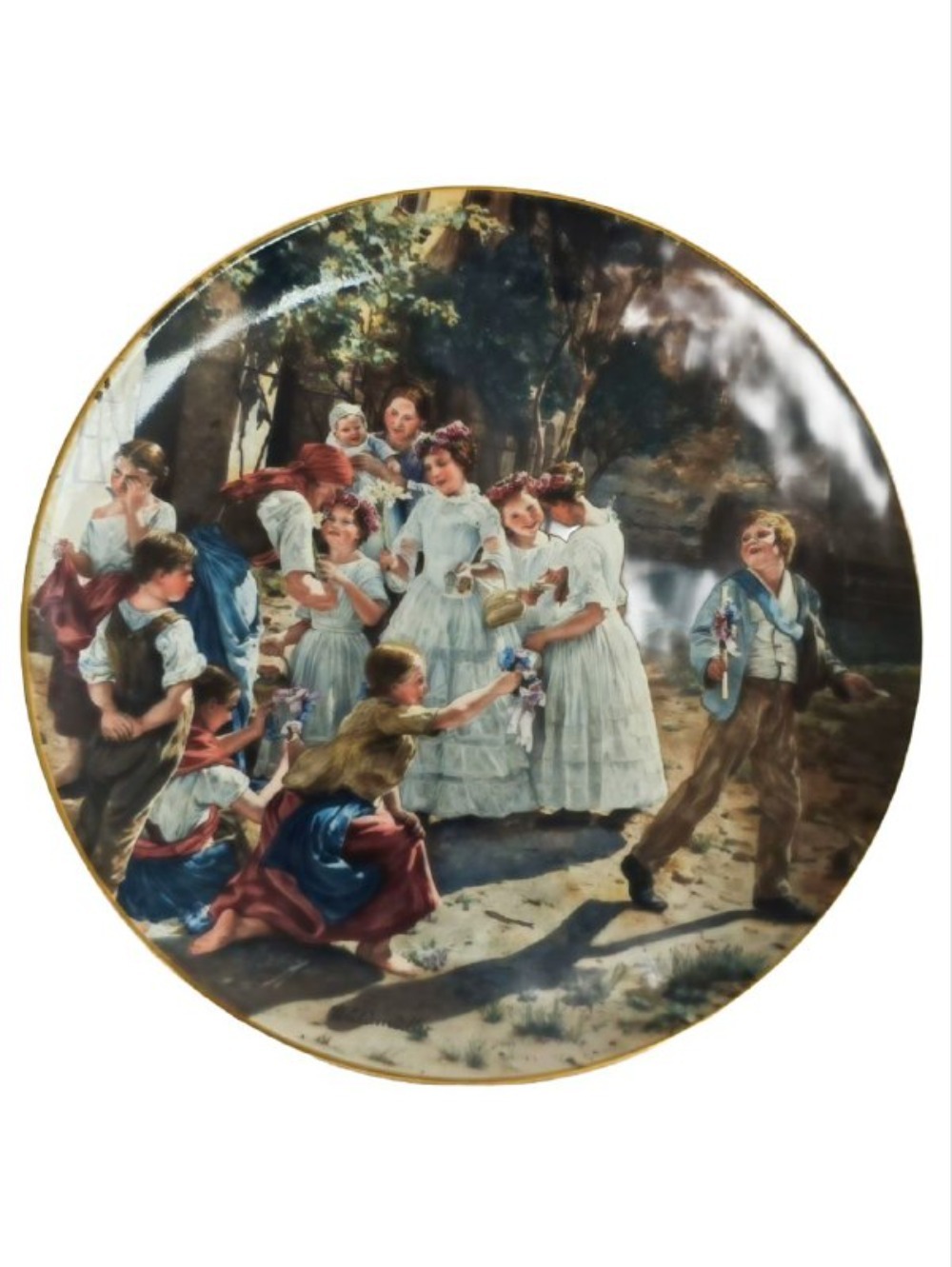 Эта прекрасная коллекционная тарелка. Картина в стиле бидермайер изображает сцену в сельской местности, где дети и молодые люди готовятся к процессии в честь праздника Тела и Крови Христовых. На ней запечатлены радостные моменты сбора цветов для украшения праздничного шествия.