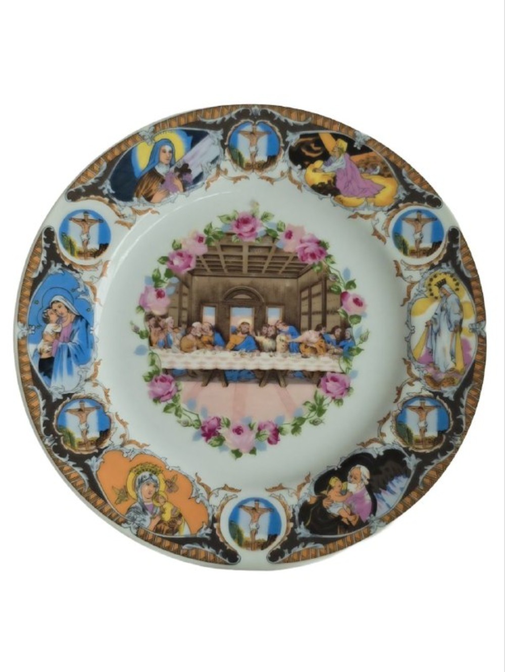 Бордюр тарелки украшен небольшими медальонами, изображающими различные религиозные сцены и фигуры, такие как Дева Мария с младенцем, распятие Иисуса Христа и другие святые.