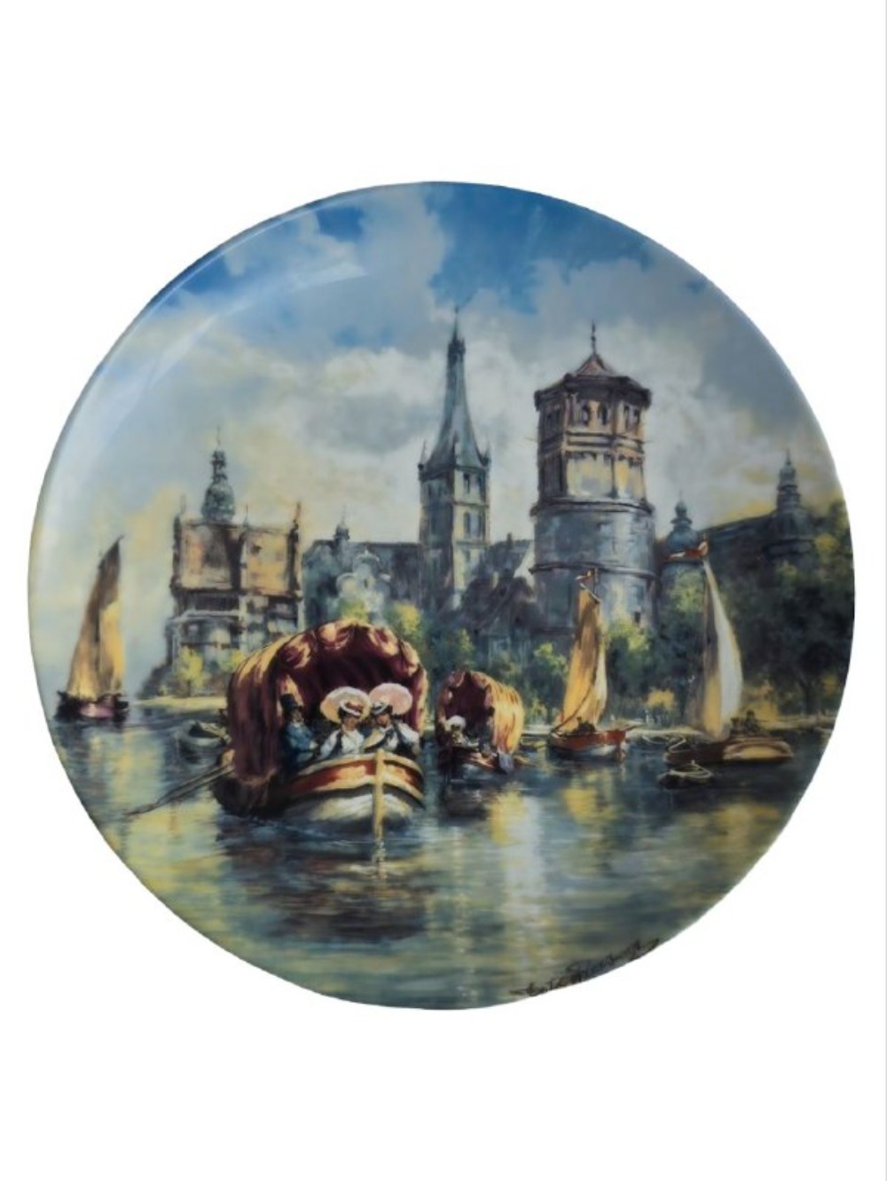 На тарелке изображен исторический вид на набережную Дюссельдорфа с лодками на переднем плане и городскими постройками, включая Шлосстурм (Замковую башню), на заднем плане.