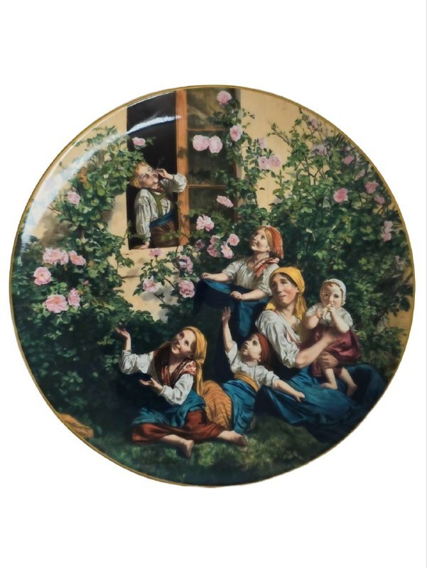 Эта прекрасная коллекционная тарелка. Картина в стиле бидермейер изображая идиллическую сельскую сцену с детьми, играющими у розового куста. Художник известен своими жанровыми сценами и вниманием к деталям.