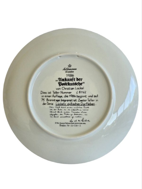 Тарелка номерная, что подтверждает ее коллекционную подлинность и ограниченный тираж (каждая тарелка выпускалась строго ограниченным периодом в 75 дней). Она внесена в каталог Bradex.