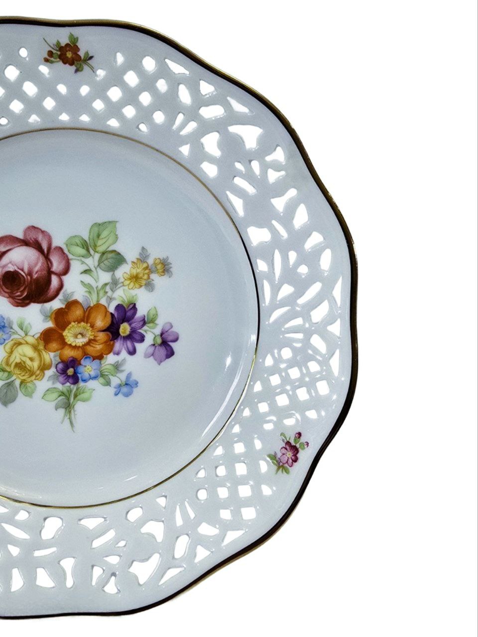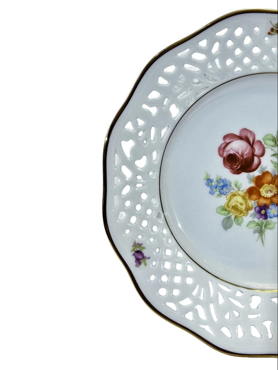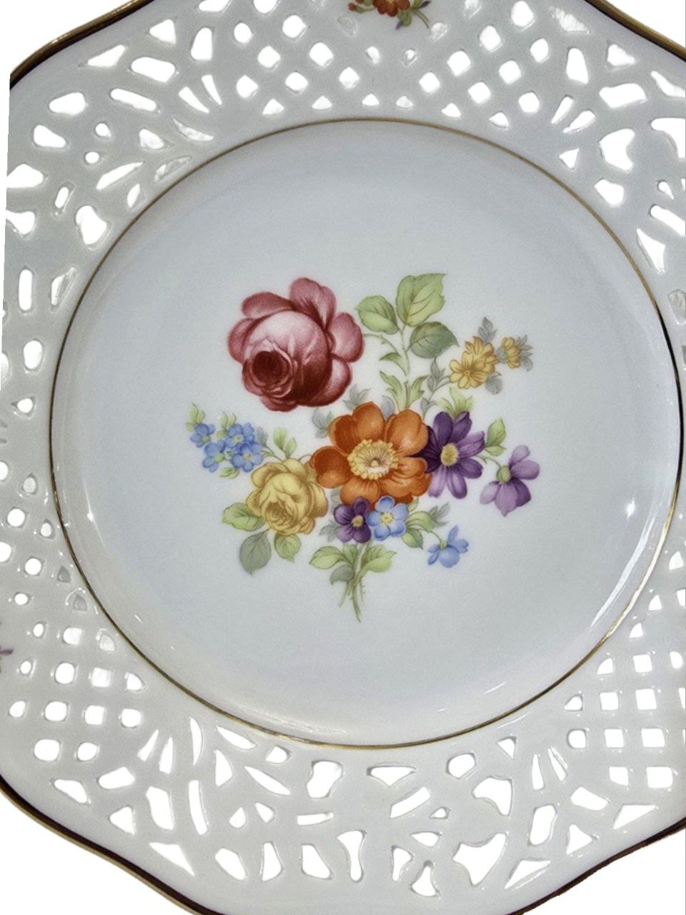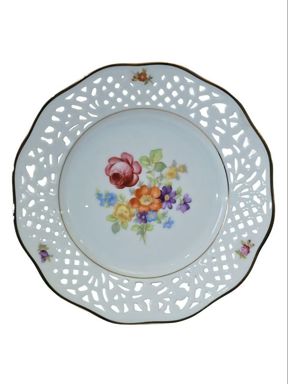 В центре тарелки изображен красочный букет из роз, оранжевых и фиолетовых цветов, а край подчеркнут тонкой золотой каймой.