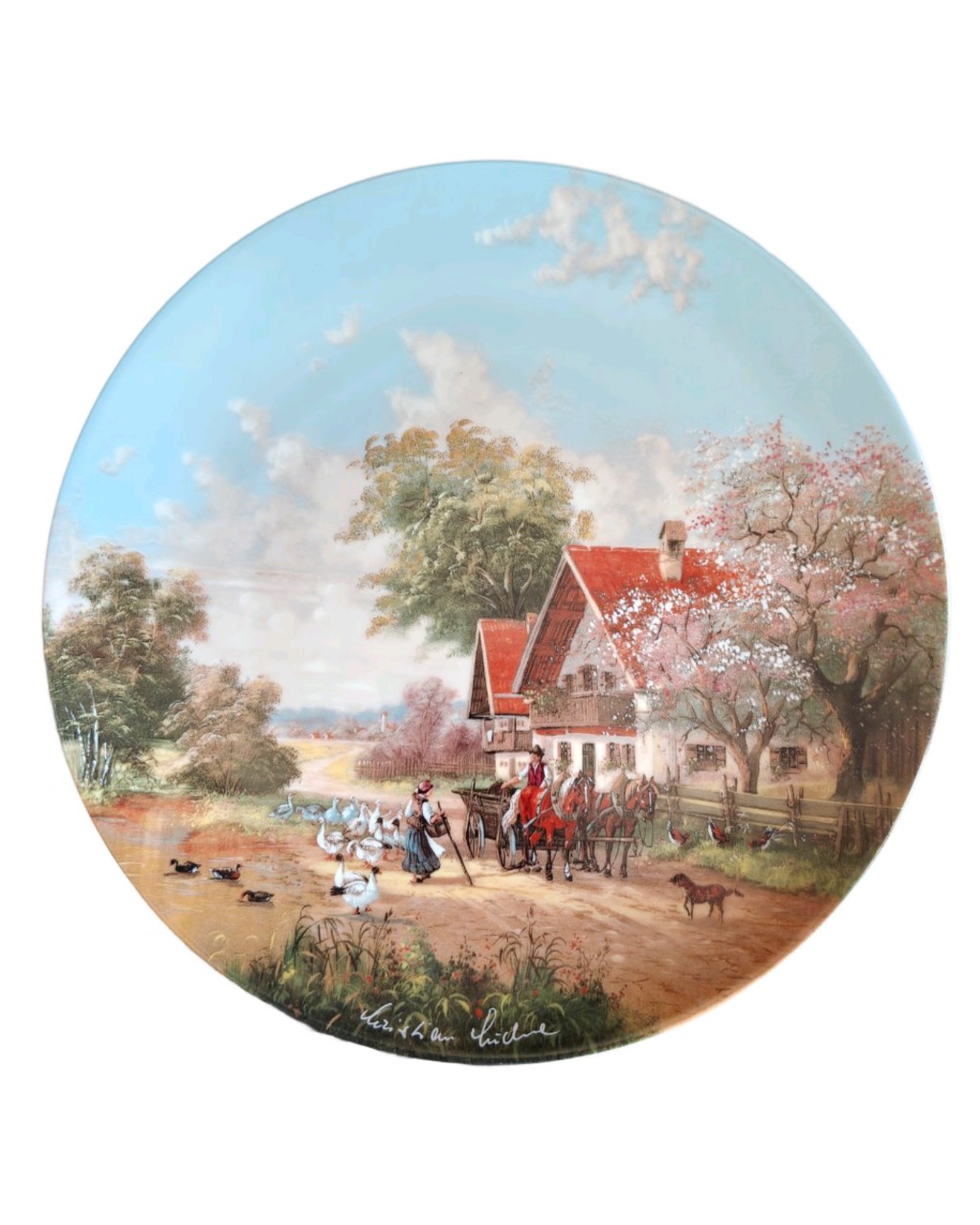 На тарелке изображена живописная сцена из жизни немецкой деревни XIX века: крестьяне на повозке, запряженной лошадьми, отправляются на рынок мимо фахверкового дома под цветущим деревом.