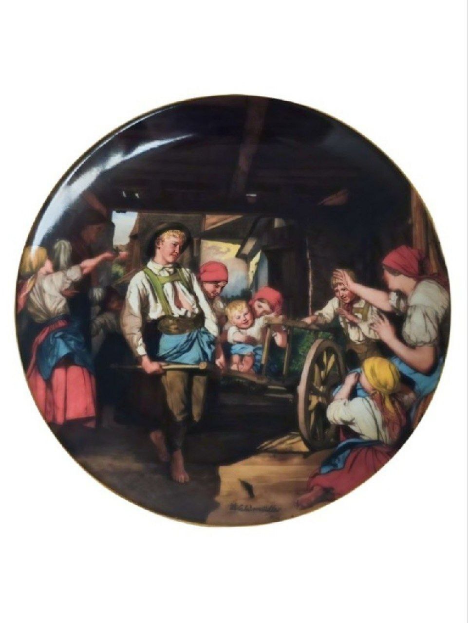 Эта прекрасная коллекционная тарелка. Картина в стиле бидермейер изображает оживленную сцену в сарае или амбаре, где молодой человек тянет тележку с детьми, а вокруг собралась семья. Сюжет отражает идиллические сельские мотивы, популярные в творчестве Вальдмюллера.
