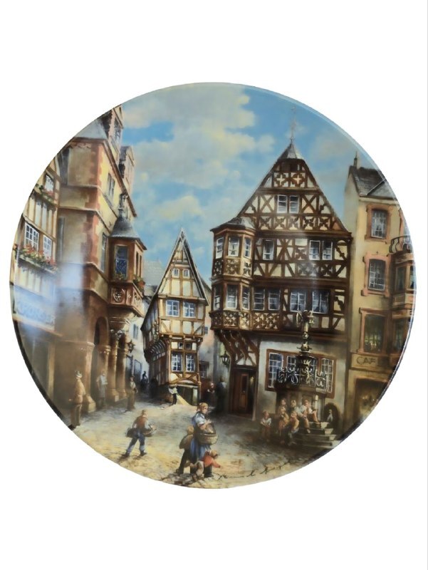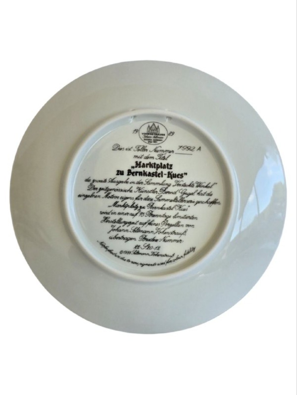 Изображение на тарелке представляет собой рисунок Рыночной площади (Marktplatz) в немецком городе Бернкастель-Кюс (Bernkastel-Kues).