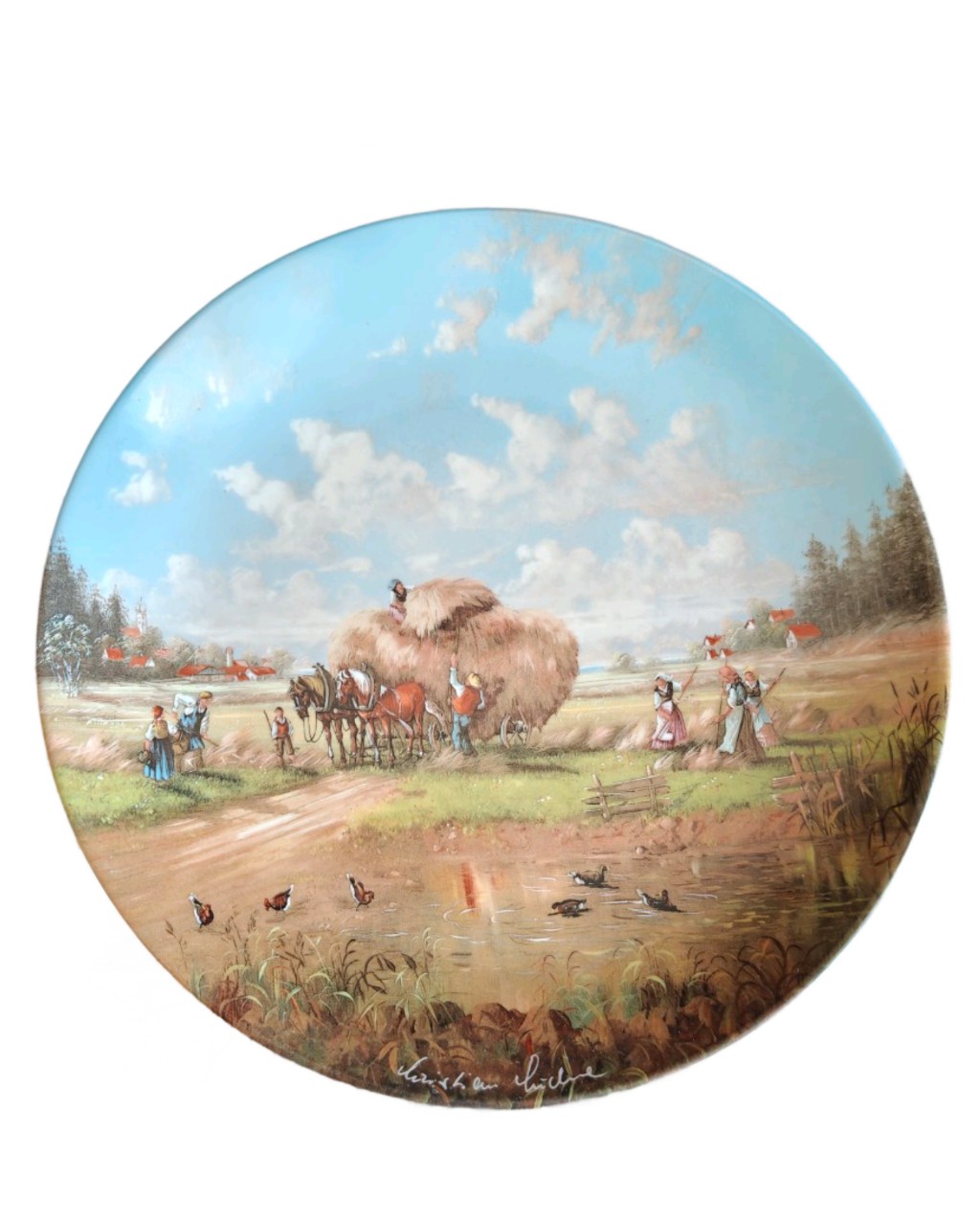 На тарелке изображен классический сельский сюжет: семья занимается сбором сена, используя повозку, запряженную лошадьми.