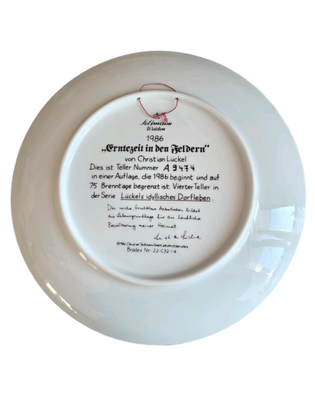 Тарелка номерная, что подтверждает ее коллекционную подлинность и ограниченный тираж (каждая тарелка выпускалась строго ограниченным периодом в 75 дней). Она внесена в каталог Bradex.