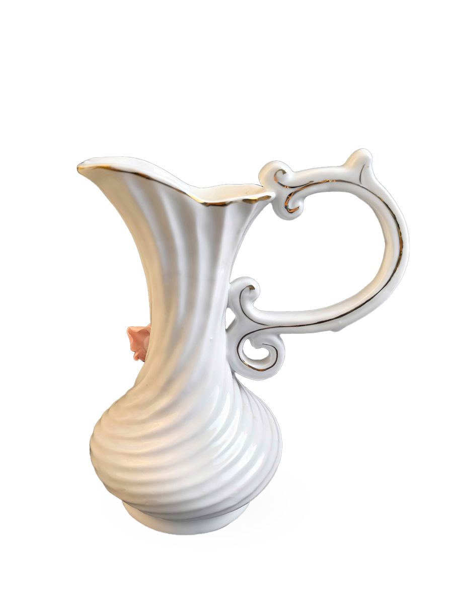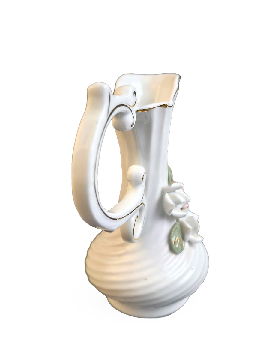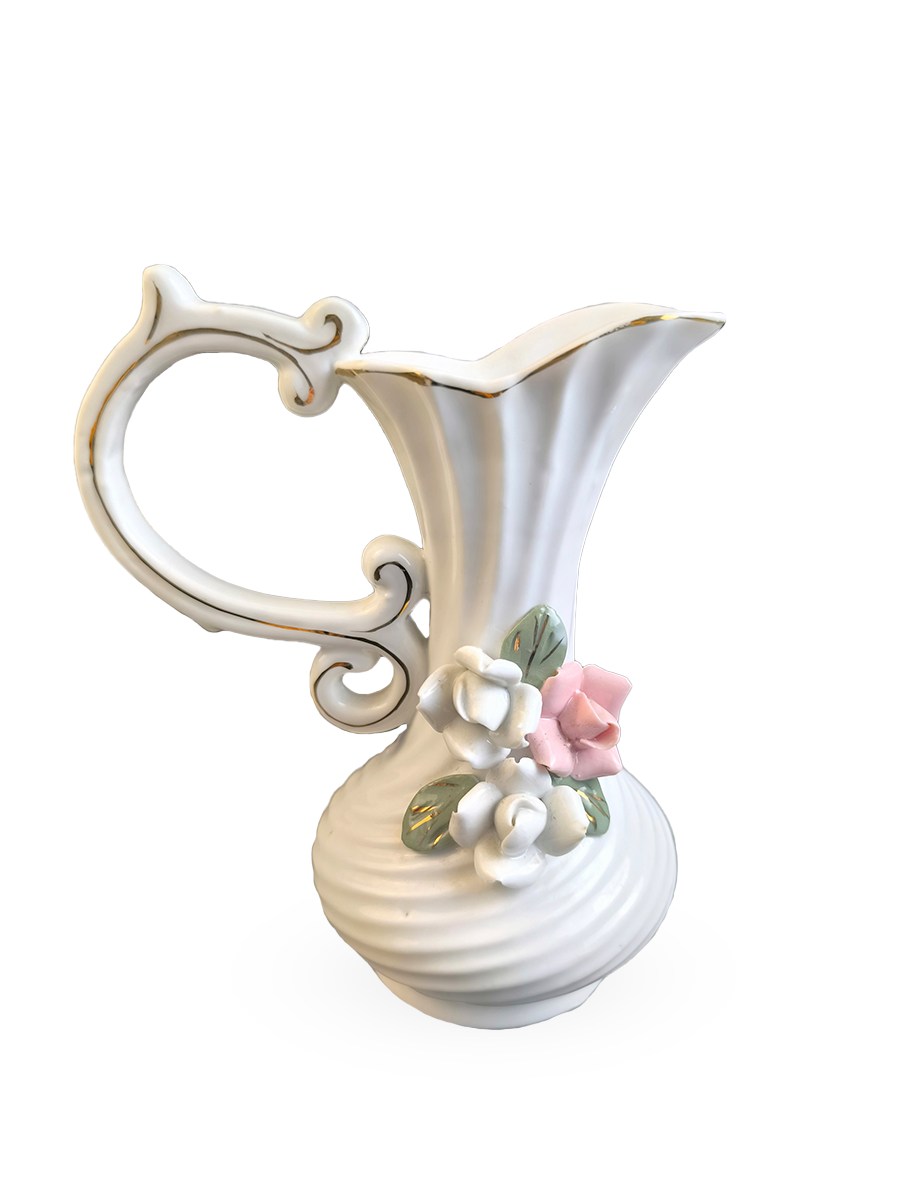 Она выполнена в форме кувшина с изящной ручкой и декорирована белыми и розовыми цветами с зелеными листьями. Подобный дизайн с объемными цветами является классическим для итальянского фарфора.